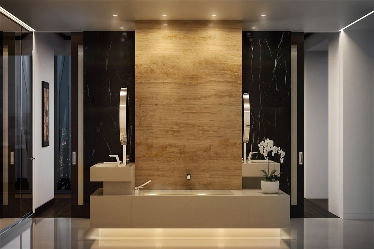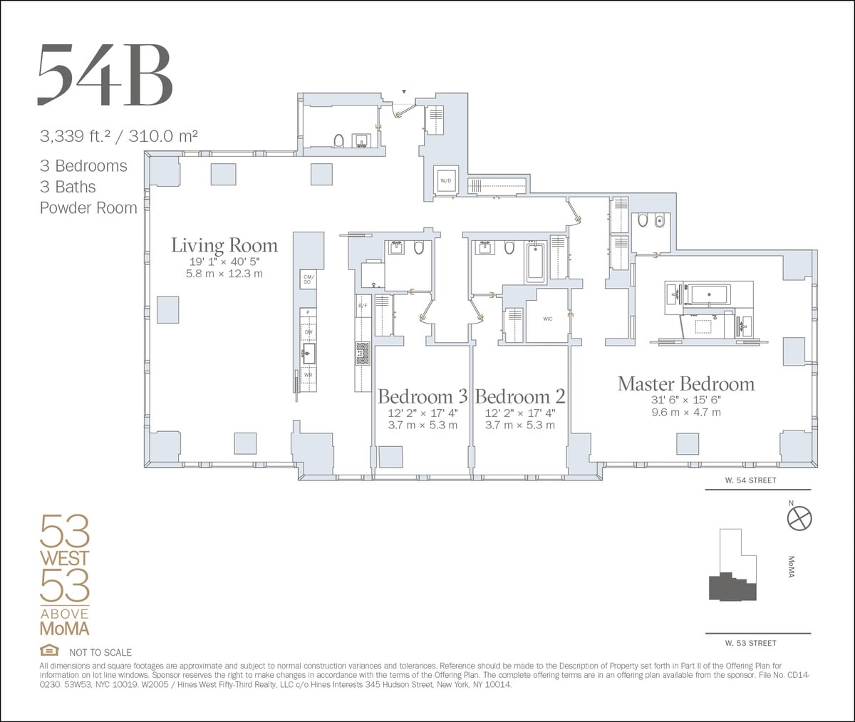 Enjoy panoramic Central Park, Hudson River, and skyline views through floor-to-ceiling windows in this half-floor residence located in the new Jean Nouvel-designed tower above The Museum of Modern Art. Nouvel's innovative exposed structural system, known as the diagrid, is expressed like a graceful, abstract piece of sculpture creating a one-of-a-kind residence unlike any other in the world. Within this 3,339 SF (312 SM) 3-bedroom home, one finds a gracious entry foyer, massively scaled living room, a palatial master suite and two generous secondary bedrooms with en-suite bathrooms. With interiors by Thierry Despont, Residence 54B also boasts an eat-in, windowed kitchen with custom cabinetry by Molteni; statuary marble countertops and backlit backsplash; and complete suite of appliances by Miele and Sub-Zero. The corner master bedroom suite includes an extremely spacious master bath that features Verona limestone slab floors and baseboard, Noir St. Laurent marble and Peruvian golden travertine feature walls. High above The Museum of Modern Art, a short walk to Fifth Avenue and mere blocks from Central Park, the Jean Nouvel-designed 53 West 53 is an exclusive collection of residences with super-luxury, hotel-like services and amenities.